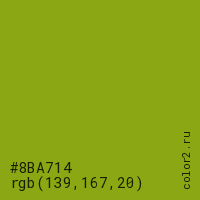 Цвет #8BA714 в цветовой модели RGB обозначается тремя октетами (139, 167, 20) в десятичном формате и #8BA714 в шестнадцатиричном (hex) формате, которые являются интенсивностью красного 139 (hex 8B), интенсивность зелёного 167 (hex A7) и интенсивность синего 20 (hex 14).