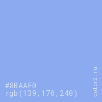 Цвет #8BAAF0 в цветовой модели RGB обозначается тремя октетами (139, 170, 240) в десятичном формате и #8BAAF0 в шестнадцатиричном (hex) формате, которые являются интенсивностью красного 139 (hex 8B), интенсивность зелёного 170 (hex AA) и интенсивность синего 240 (hex F0).