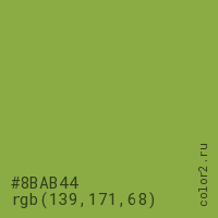 Цвет #8BAB44 в цветовой модели RGB обозначается тремя октетами (139, 171, 68) в десятичном формате и #8BAB44 в шестнадцатиричном (hex) формате, которые являются интенсивностью красного 139 (hex 8B), интенсивность зелёного 171 (hex AB) и интенсивность синего 68 (hex 44).