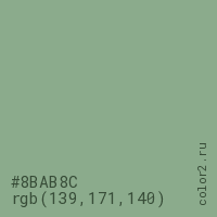 Цвет #8BAB8C в цветовой модели RGB обозначается тремя октетами (139, 171, 140) в десятичном формате и #8BAB8C в шестнадцатиричном (hex) формате, которые являются интенсивностью красного 139 (hex 8B), интенсивность зелёного 171 (hex AB) и интенсивность синего 140 (hex 8C).