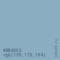 Цвет #8BADC2 в цветовой модели RGB обозначается тремя октетами (139, 173, 194) в десятичном формате и #8BADC2 в шестнадцатиричном (hex) формате, которые являются интенсивностью красного 139 (hex 8B), интенсивность зелёного 173 (hex AD) и интенсивность синего 194 (hex C2).