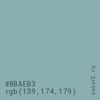 Цвет #8BAEB3 в цветовой модели RGB обозначается тремя октетами (139, 174, 179) в десятичном формате и #8BAEB3 в шестнадцатиричном (hex) формате, которые являются интенсивностью красного 139 (hex 8B), интенсивность зелёного 174 (hex AE) и интенсивность синего 179 (hex B3).