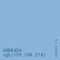 Цвет #8BB4DA в цветовой модели RGB обозначается тремя октетами (139, 180, 218) в десятичном формате и #8BB4DA в шестнадцатиричном (hex) формате, которые являются интенсивностью красного 139 (hex 8B), интенсивность зелёного 180 (hex B4) и интенсивность синего 218 (hex DA).