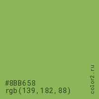 Цвет #8BB658 в цветовой модели RGB обозначается тремя октетами (139, 182, 88) в десятичном формате и #8BB658 в шестнадцатиричном (hex) формате, которые являются интенсивностью красного 139 (hex 8B), интенсивность зелёного 182 (hex B6) и интенсивность синего 88 (hex 58).