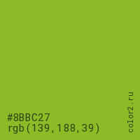 Цвет #8BBC27 в цветовой модели RGB обозначается тремя октетами (139, 188, 39) в десятичном формате и #8BBC27 в шестнадцатиричном (hex) формате, которые являются интенсивностью красного 139 (hex 8B), интенсивность зелёного 188 (hex BC) и интенсивность синего 39 (hex 27).