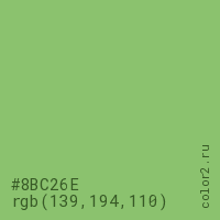 Цвет #8BC26E в цветовой модели RGB обозначается тремя октетами (139, 194, 110) в десятичном формате и #8BC26E в шестнадцатиричном (hex) формате, которые являются интенсивностью красного 139 (hex 8B), интенсивность зелёного 194 (hex C2) и интенсивность синего 110 (hex 6E).