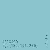 Цвет #8BC4CD в цветовой модели RGB обозначается тремя октетами (139, 196, 205) в десятичном формате и #8BC4CD в шестнадцатиричном (hex) формате, которые являются интенсивностью красного 139 (hex 8B), интенсивность зелёного 196 (hex C4) и интенсивность синего 205 (hex CD).