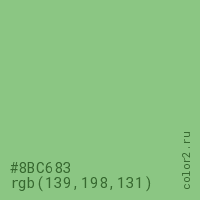 Цвет #8BC683 в цветовой модели RGB обозначается тремя октетами (139, 198, 131) в десятичном формате и #8BC683 в шестнадцатиричном (hex) формате, которые являются интенсивностью красного 139 (hex 8B), интенсивность зелёного 198 (hex C6) и интенсивность синего 131 (hex 83).
