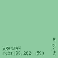 Цвет #8BCA9F в цветовой модели RGB обозначается тремя октетами (139, 202, 159) в десятичном формате и #8BCA9F в шестнадцатиричном (hex) формате, которые являются интенсивностью красного 139 (hex 8B), интенсивность зелёного 202 (hex CA) и интенсивность синего 159 (hex 9F).