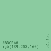 Цвет #8BCBA0 в цветовой модели RGB обозначается тремя октетами (139, 203, 160) в десятичном формате и #8BCBA0 в шестнадцатиричном (hex) формате, которые являются интенсивностью красного 139 (hex 8B), интенсивность зелёного 203 (hex CB) и интенсивность синего 160 (hex A0).