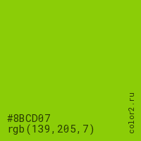 Цвет #8BCD07 в цветовой модели RGB обозначается тремя октетами (139, 205, 7) в десятичном формате и #8BCD07 в шестнадцатиричном (hex) формате, которые являются интенсивностью красного 139 (hex 8B), интенсивность зелёного 205 (hex CD) и интенсивность синего 7 (hex 07).
