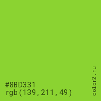Цвет #8BD331 в цветовой модели RGB обозначается тремя октетами (139, 211, 49) в десятичном формате и #8BD331 в шестнадцатиричном (hex) формате, которые являются интенсивностью красного 139 (hex 8B), интенсивность зелёного 211 (hex D3) и интенсивность синего 49 (hex 31).
