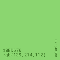 Цвет #8BD670 в цветовой модели RGB обозначается тремя октетами (139, 214, 112) в десятичном формате и #8BD670 в шестнадцатиричном (hex) формате, которые являются интенсивностью красного 139 (hex 8B), интенсивность зелёного 214 (hex D6) и интенсивность синего 112 (hex 70).