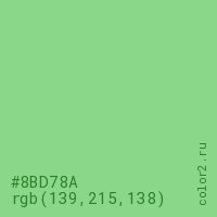 Цвет #8BD78A в цветовой модели RGB обозначается тремя октетами (139, 215, 138) в десятичном формате и #8BD78A в шестнадцатиричном (hex) формате, которые являются интенсивностью красного 139 (hex 8B), интенсивность зелёного 215 (hex D7) и интенсивность синего 138 (hex 8A).