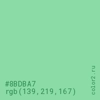 Цвет #8BDBA7 в цветовой модели RGB обозначается тремя октетами (139, 219, 167) в десятичном формате и #8BDBA7 в шестнадцатиричном (hex) формате, которые являются интенсивностью красного 139 (hex 8B), интенсивность зелёного 219 (hex DB) и интенсивность синего 167 (hex A7).