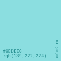 Цвет #8BDEE0 в цветовой модели RGB обозначается тремя октетами (139, 222, 224) в десятичном формате и #8BDEE0 в шестнадцатиричном (hex) формате, которые являются интенсивностью красного 139 (hex 8B), интенсивность зелёного 222 (hex DE) и интенсивность синего 224 (hex E0).