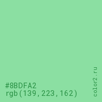 Цвет #8BDFA2 в цветовой модели RGB обозначается тремя октетами (139, 223, 162) в десятичном формате и #8BDFA2 в шестнадцатиричном (hex) формате, которые являются интенсивностью красного 139 (hex 8B), интенсивность зелёного 223 (hex DF) и интенсивность синего 162 (hex A2).