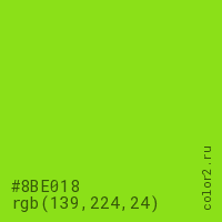 Цвет #8BE018 в цветовой модели RGB обозначается тремя октетами (139, 224, 24) в десятичном формате и #8BE018 в шестнадцатиричном (hex) формате, которые являются интенсивностью красного 139 (hex 8B), интенсивность зелёного 224 (hex E0) и интенсивность синего 24 (hex 18).