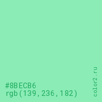 Цвет #8BECB6 в цветовой модели RGB обозначается тремя октетами (139, 236, 182) в десятичном формате и #8BECB6 в шестнадцатиричном (hex) формате, которые являются интенсивностью красного 139 (hex 8B), интенсивность зелёного 236 (hex EC) и интенсивность синего 182 (hex B6).