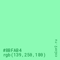 Цвет #8BFAB4 в цветовой модели RGB обозначается тремя октетами (139, 250, 180) в десятичном формате и #8BFAB4 в шестнадцатиричном (hex) формате, которые являются интенсивностью красного 139 (hex 8B), интенсивность зелёного 250 (hex FA) и интенсивность синего 180 (hex B4).
