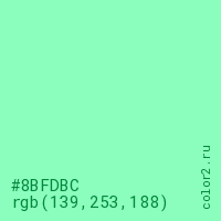 Цвет #8BFDBC в цветовой модели RGB обозначается тремя октетами (139, 253, 188) в десятичном формате и #8BFDBC в шестнадцатиричном (hex) формате, которые являются интенсивностью красного 139 (hex 8B), интенсивность зелёного 253 (hex FD) и интенсивность синего 188 (hex BC).