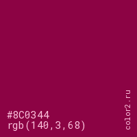 Цвет #8C0344 в цветовой модели RGB обозначается тремя октетами (140, 3, 68) в десятичном формате и #8C0344 в шестнадцатиричном (hex) формате, которые являются интенсивностью красного 140 (hex 8C), интенсивность зелёного 3 (hex 03) и интенсивность синего 68 (hex 44).