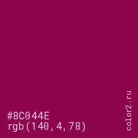 Цвет #8C044E в цветовой модели RGB обозначается тремя октетами (140, 4, 78) в десятичном формате и #8C044E в шестнадцатиричном (hex) формате, которые являются интенсивностью красного 140 (hex 8C), интенсивность зелёного 4 (hex 04) и интенсивность синего 78 (hex 4E).