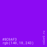Цвет #8C0AF3 в цветовой модели RGB обозначается тремя октетами (140, 10, 243) в десятичном формате и #8C0AF3 в шестнадцатиричном (hex) формате, которые являются интенсивностью красного 140 (hex 8C), интенсивность зелёного 10 (hex 0A) и интенсивность синего 243 (hex F3).