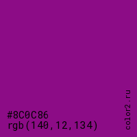 Цвет #8C0C86 в цветовой модели RGB обозначается тремя октетами (140, 12, 134) в десятичном формате и #8C0C86 в шестнадцатиричном (hex) формате, которые являются интенсивностью красного 140 (hex 8C), интенсивность зелёного 12 (hex 0C) и интенсивность синего 134 (hex 86).