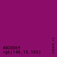 Цвет #8C0D69 в цветовой модели RGB обозначается тремя октетами (140, 13, 105) в десятичном формате и #8C0D69 в шестнадцатиричном (hex) формате, которые являются интенсивностью красного 140 (hex 8C), интенсивность зелёного 13 (hex 0D) и интенсивность синего 105 (hex 69).