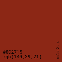Цвет #8C2715 в цветовой модели RGB обозначается тремя октетами (140, 39, 21) в десятичном формате и #8C2715 в шестнадцатиричном (hex) формате, которые являются интенсивностью красного 140 (hex 8C), интенсивность зелёного 39 (hex 27) и интенсивность синего 21 (hex 15).