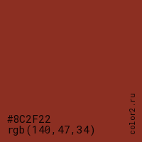 Цвет #8C2F22 в цветовой модели RGB обозначается тремя октетами (140, 47, 34) в десятичном формате и #8C2F22 в шестнадцатиричном (hex) формате, которые являются интенсивностью красного 140 (hex 8C), интенсивность зелёного 47 (hex 2F) и интенсивность синего 34 (hex 22).