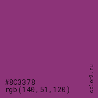 Цвет #8C3378 в цветовой модели RGB обозначается тремя октетами (140, 51, 120) в десятичном формате и #8C3378 в шестнадцатиричном (hex) формате, которые являются интенсивностью красного 140 (hex 8C), интенсивность зелёного 51 (hex 33) и интенсивность синего 120 (hex 78).