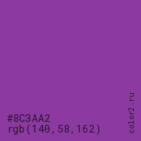 Цвет #8C3AA2 в цветовой модели RGB обозначается тремя октетами (140, 58, 162) в десятичном формате и #8C3AA2 в шестнадцатиричном (hex) формате, которые являются интенсивностью красного 140 (hex 8C), интенсивность зелёного 58 (hex 3A) и интенсивность синего 162 (hex A2).