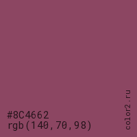 Цвет #8C4662 в цветовой модели RGB обозначается тремя октетами (140, 70, 98) в десятичном формате и #8C4662 в шестнадцатиричном (hex) формате, которые являются интенсивностью красного 140 (hex 8C), интенсивность зелёного 70 (hex 46) и интенсивность синего 98 (hex 62).