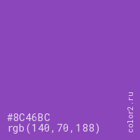 Цвет #8C46BC в цветовой модели RGB обозначается тремя октетами (140, 70, 188) в десятичном формате и #8C46BC в шестнадцатиричном (hex) формате, которые являются интенсивностью красного 140 (hex 8C), интенсивность зелёного 70 (hex 46) и интенсивность синего 188 (hex BC).