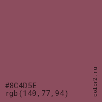 Цвет #8C4D5E в цветовой модели RGB обозначается тремя октетами (140, 77, 94) в десятичном формате и #8C4D5E в шестнадцатиричном (hex) формате, которые являются интенсивностью красного 140 (hex 8C), интенсивность зелёного 77 (hex 4D) и интенсивность синего 94 (hex 5E).