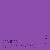 Цвет #8C4DAC в цветовой модели RGB обозначается тремя октетами (140, 77, 172) в десятичном формате и #8C4DAC в шестнадцатиричном (hex) формате, которые являются интенсивностью красного 140 (hex 8C), интенсивность зелёного 77 (hex 4D) и интенсивность синего 172 (hex AC).