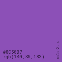 Цвет #8C50B7 в цветовой модели RGB обозначается тремя октетами (140, 80, 183) в десятичном формате и #8C50B7 в шестнадцатиричном (hex) формате, которые являются интенсивностью красного 140 (hex 8C), интенсивность зелёного 80 (hex 50) и интенсивность синего 183 (hex B7).
