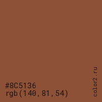Цвет #8C5136 в цветовой модели RGB обозначается тремя октетами (140, 81, 54) в десятичном формате и #8C5136 в шестнадцатиричном (hex) формате, которые являются интенсивностью красного 140 (hex 8C), интенсивность зелёного 81 (hex 51) и интенсивность синего 54 (hex 36).