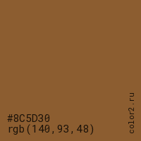 Цвет #8C5D30 в цветовой модели RGB обозначается тремя октетами (140, 93, 48) в десятичном формате и #8C5D30 в шестнадцатиричном (hex) формате, которые являются интенсивностью красного 140 (hex 8C), интенсивность зелёного 93 (hex 5D) и интенсивность синего 48 (hex 30).