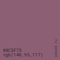 Цвет #8C5F75 в цветовой модели RGB обозначается тремя октетами (140, 95, 117) в десятичном формате и #8C5F75 в шестнадцатиричном (hex) формате, которые являются интенсивностью красного 140 (hex 8C), интенсивность зелёного 95 (hex 5F) и интенсивность синего 117 (hex 75).