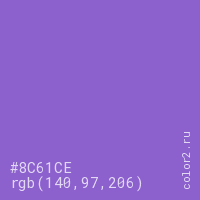 Цвет #8C61CE в цветовой модели RGB обозначается тремя октетами (140, 97, 206) в десятичном формате и #8C61CE в шестнадцатиричном (hex) формате, которые являются интенсивностью красного 140 (hex 8C), интенсивность зелёного 97 (hex 61) и интенсивность синего 206 (hex CE).