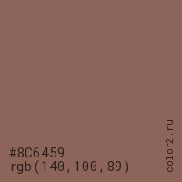 Цвет #8C6459 в цветовой модели RGB обозначается тремя октетами (140, 100, 89) в десятичном формате и #8C6459 в шестнадцатиричном (hex) формате, которые являются интенсивностью красного 140 (hex 8C), интенсивность зелёного 100 (hex 64) и интенсивность синего 89 (hex 59).