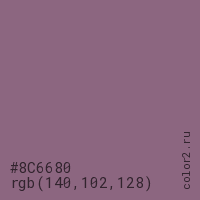 Цвет #8C6680 в цветовой модели RGB обозначается тремя октетами (140, 102, 128) в десятичном формате и #8C6680 в шестнадцатиричном (hex) формате, которые являются интенсивностью красного 140 (hex 8C), интенсивность зелёного 102 (hex 66) и интенсивность синего 128 (hex 80).