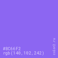 Цвет #8C66F2 в цветовой модели RGB обозначается тремя октетами (140, 102, 242) в десятичном формате и #8C66F2 в шестнадцатиричном (hex) формате, которые являются интенсивностью красного 140 (hex 8C), интенсивность зелёного 102 (hex 66) и интенсивность синего 242 (hex F2).