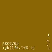 Цвет #8C6705 в цветовой модели RGB обозначается тремя октетами (140, 103, 5) в десятичном формате и #8C6705 в шестнадцатиричном (hex) формате, которые являются интенсивностью красного 140 (hex 8C), интенсивность зелёного 103 (hex 67) и интенсивность синего 5 (hex 05).