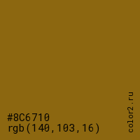 Цвет #8C6710 в цветовой модели RGB обозначается тремя октетами (140, 103, 16) в десятичном формате и #8C6710 в шестнадцатиричном (hex) формате, которые являются интенсивностью красного 140 (hex 8C), интенсивность зелёного 103 (hex 67) и интенсивность синего 16 (hex 10).