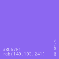 Цвет #8C67F1 в цветовой модели RGB обозначается тремя октетами (140, 103, 241) в десятичном формате и #8C67F1 в шестнадцатиричном (hex) формате, которые являются интенсивностью красного 140 (hex 8C), интенсивность зелёного 103 (hex 67) и интенсивность синего 241 (hex F1).