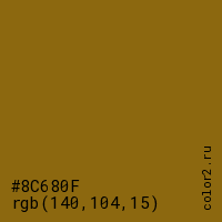 Цвет #8C680F в цветовой модели RGB обозначается тремя октетами (140, 104, 15) в десятичном формате и #8C680F в шестнадцатиричном (hex) формате, которые являются интенсивностью красного 140 (hex 8C), интенсивность зелёного 104 (hex 68) и интенсивность синего 15 (hex 0F).